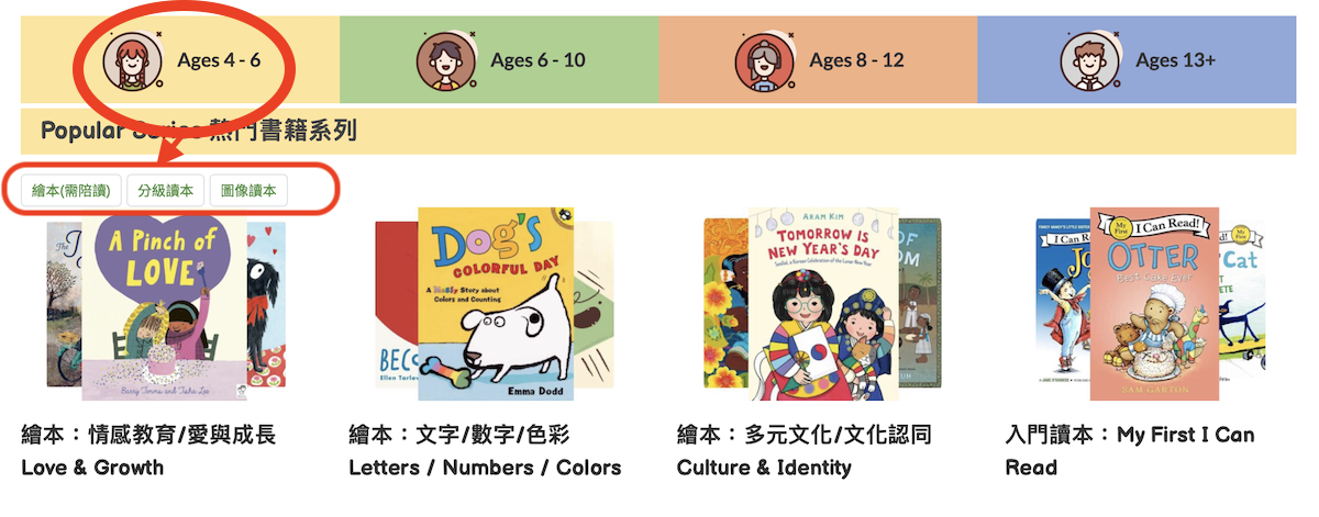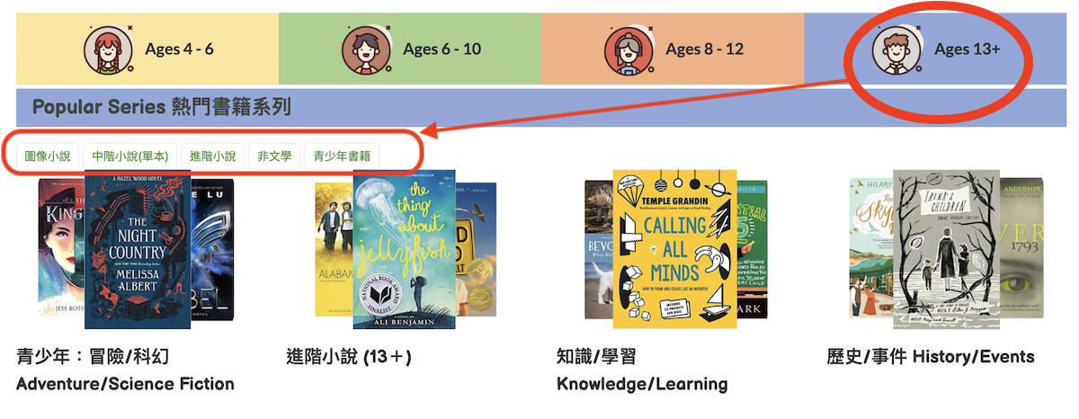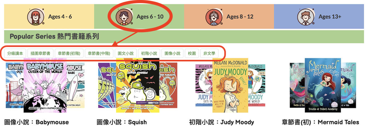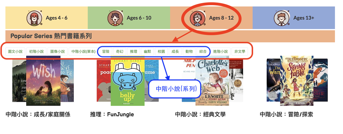 備註:在Age8-12分齡之下的「中階小說」系列特別多,所以另外以主題再做細分。